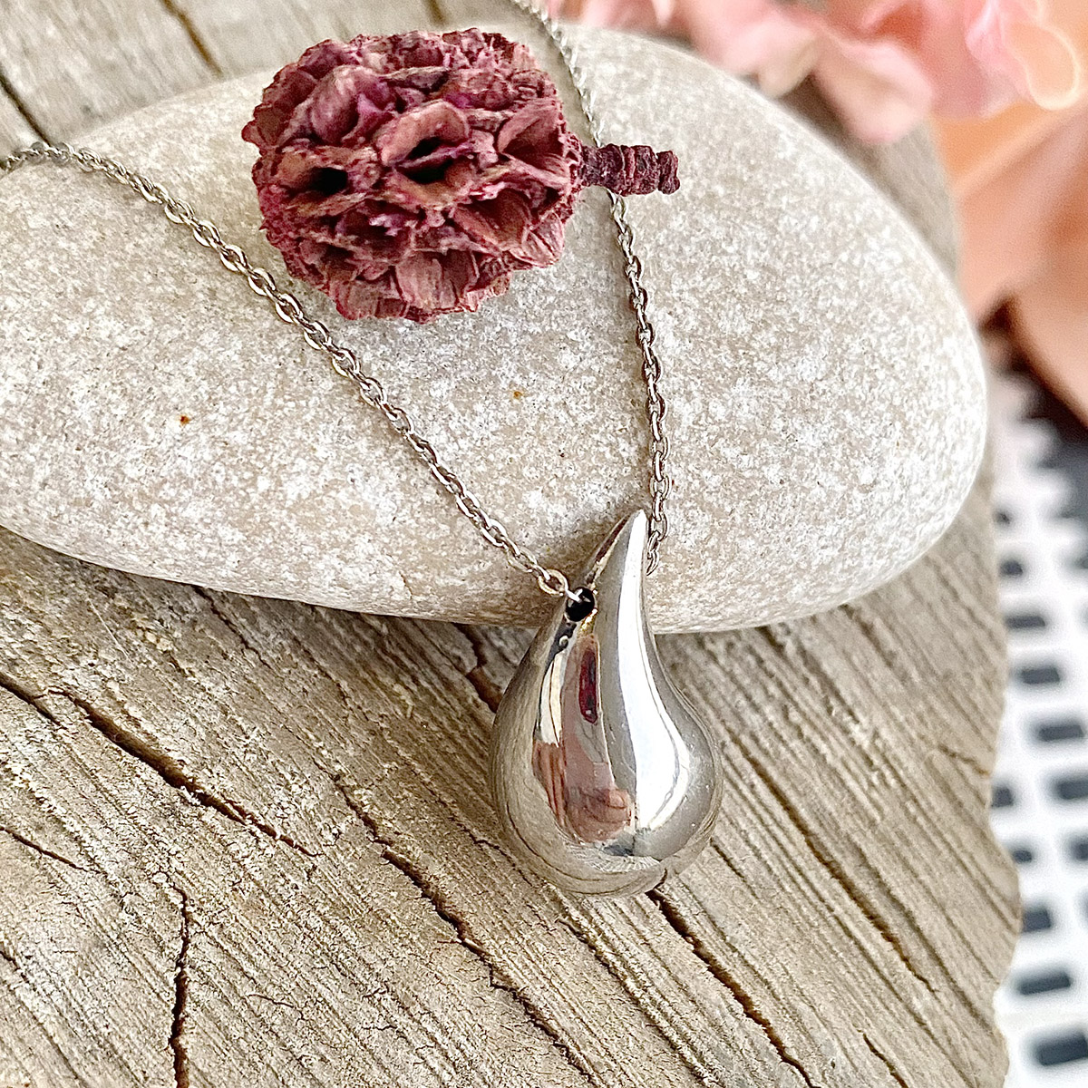 Srebrna ogrlica „Silver Drop“, rodinirana, modernog dizajna, sa priveskom oblika kapi.