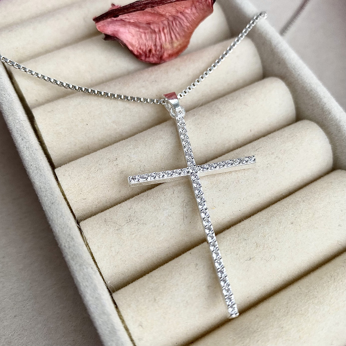 Elegantna srebrna ogrlica „Vera“ sa priveskom u obliku krsta ukrašenog blistavim cirkonima.