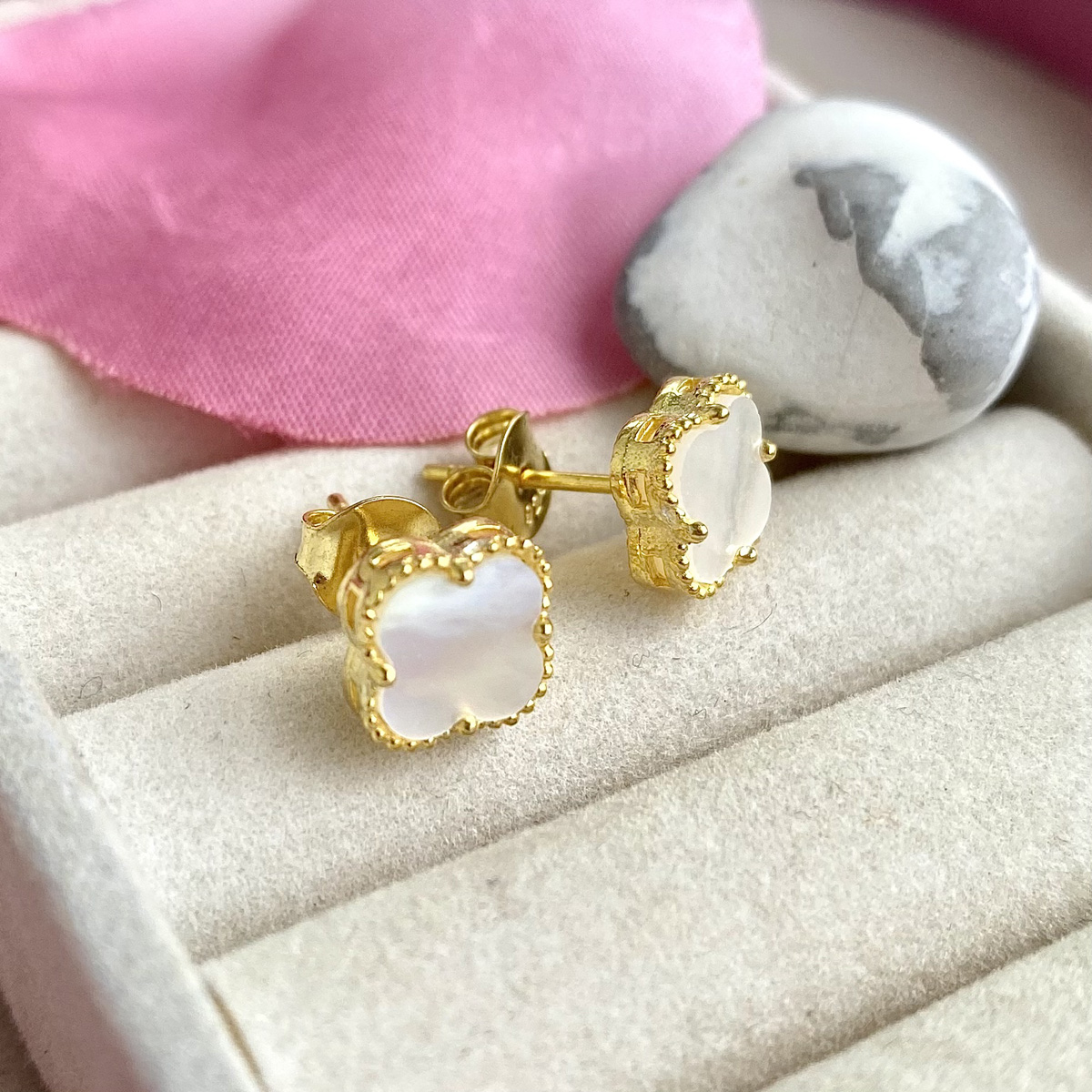Unesite dozu elegancije i  optimizmae u svoj stil uz srebrne minđuše sa pozlatom i belim sedefom u obliku  deteline sa četiri lista.