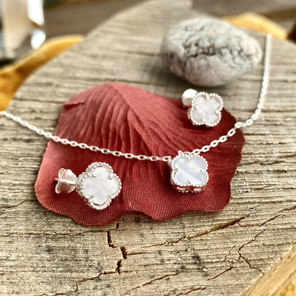 Srebrni set „Deteline“ sa motivom deteline sa sedefom, sastoji se iz srebrne ogrlice i mindjuša na srafič.